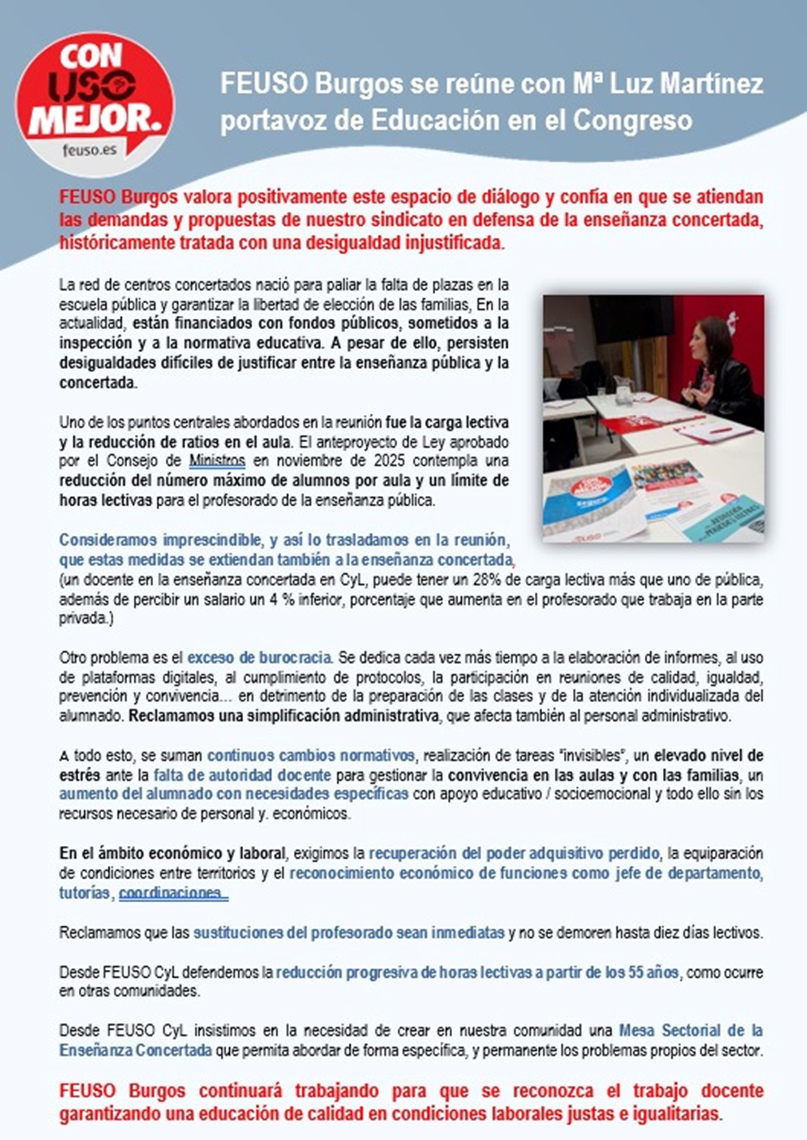 FEUSO Burgos valora positivamente este espacio de diálogo y confía en que se atiendan las demandas y propuestas de nuestro sindicato en defensa de la enseñanza concertada, históricamente tratada con una desigualdad injustificada.