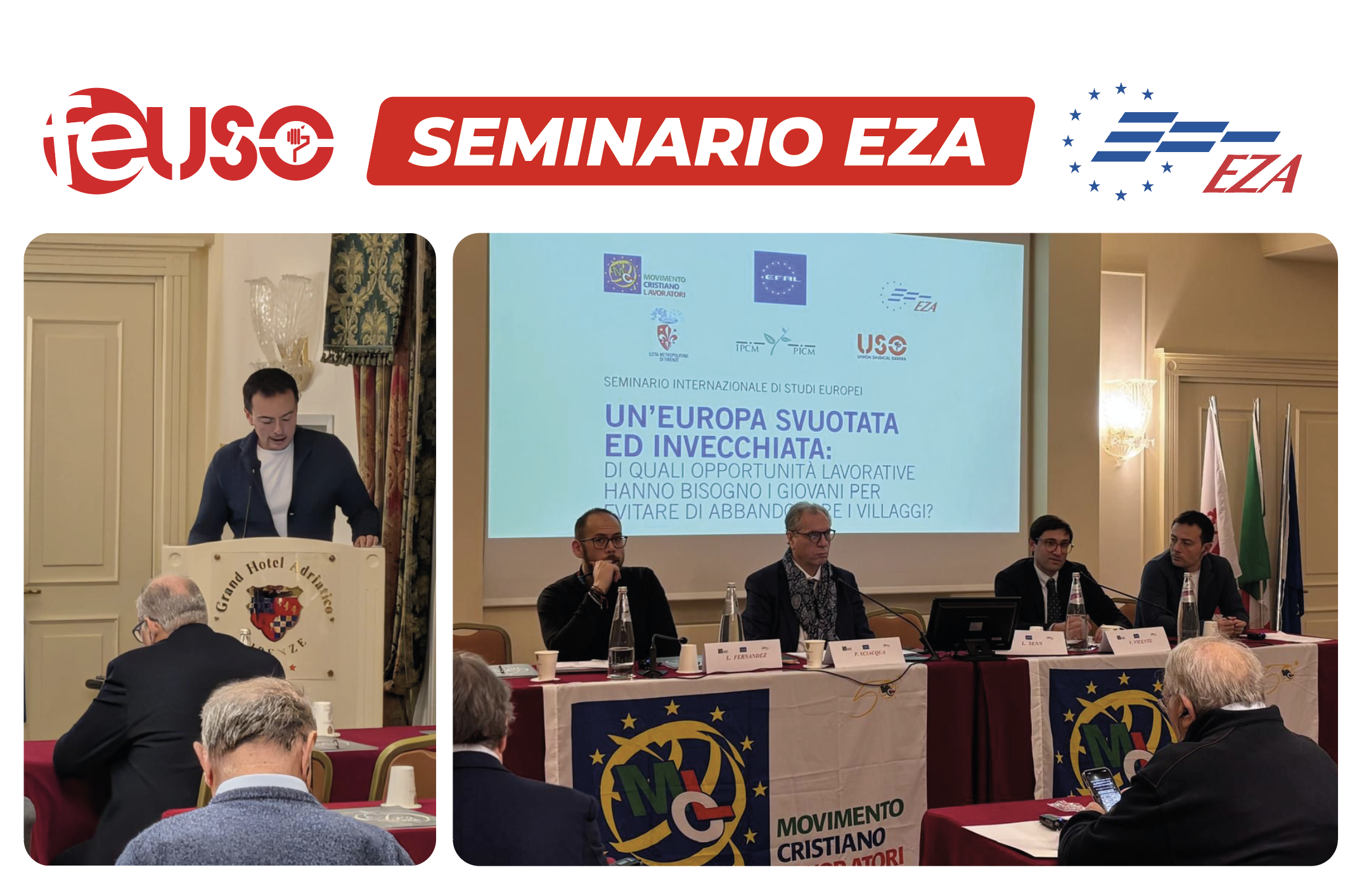 Los pasados 16 y 17 de febrero, el vocal de la Federación Estatal de FEUSO, Adrián Jiménez, participó en el seminario de EZA “Europa Desierta y Anticuada: ¿Qué oportunidades laborales necesitan los jóvenes para no huir de sus pueblos?”, celebrado en Florencia. Durante su intervención, abordó qué necesitan los jóvenes de hoy en relación con la formación como vía de acceso al empleo en los entornos rurales, describiendo la realidad de estos territorios y la importancia de ofrecer una orientación realista y una formación vinculada a las oportunidades laborales del entorno, así como el desarrollo de competencias transversales adaptadas a la sociedad actual.